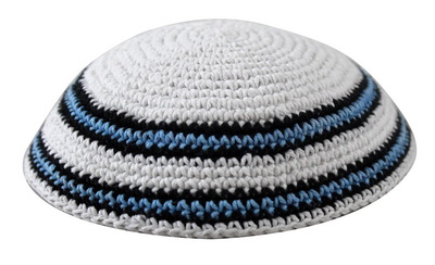 כיפה סרוגה 16 ס"מ לבן מסביב שני פסים שחור ותכלת