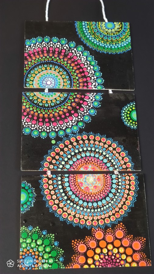 המנדלה עשויה בקומפוזיציה נפלאה של צבעי אקריליק כאשר כל נקודה נבנת על הקודמת בשכבות וכך נוצר הנפח.