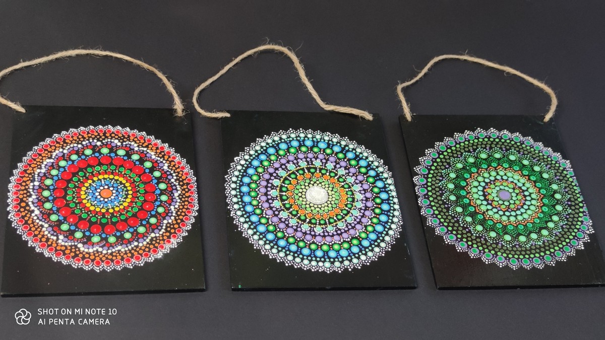 המנדלה עבודת יד על עץ . לעץ מחובר חוט לתליה ..